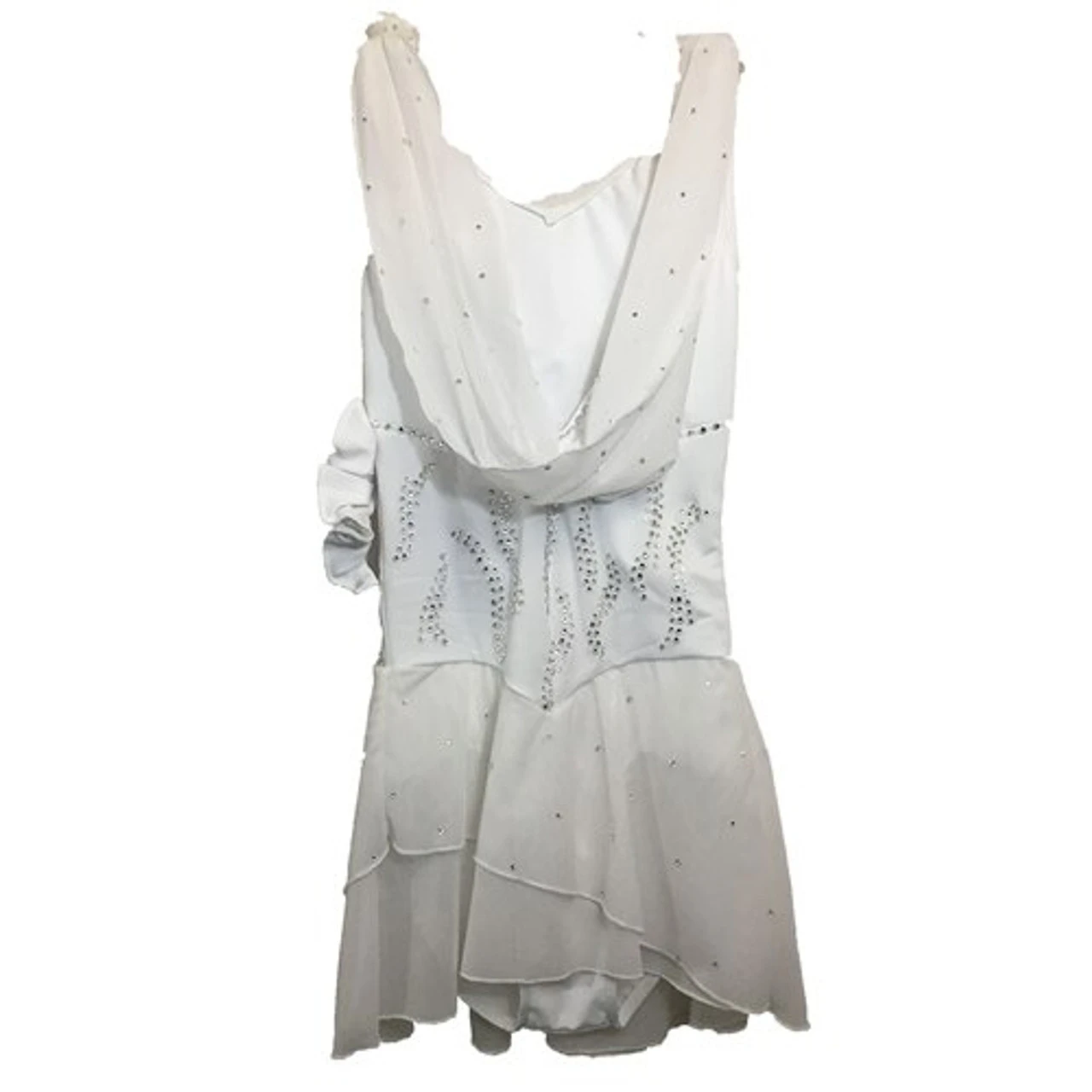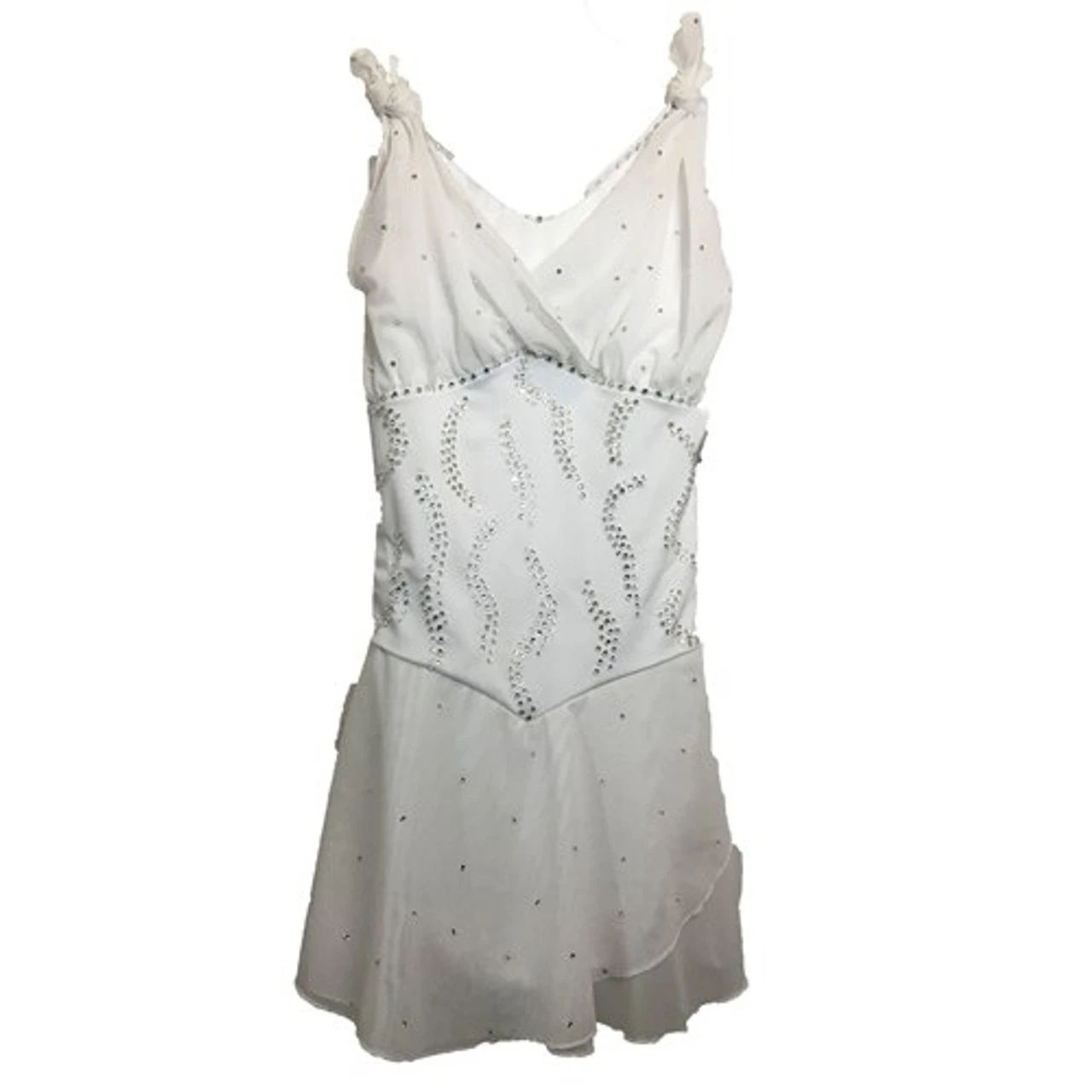 What skater wouldn’t feel like a princess in this amazing dress? Upper bodice draped in chiffon and tied at shoulders. Back dips low with chiffon drapes–double-layer angled mesh skirt.