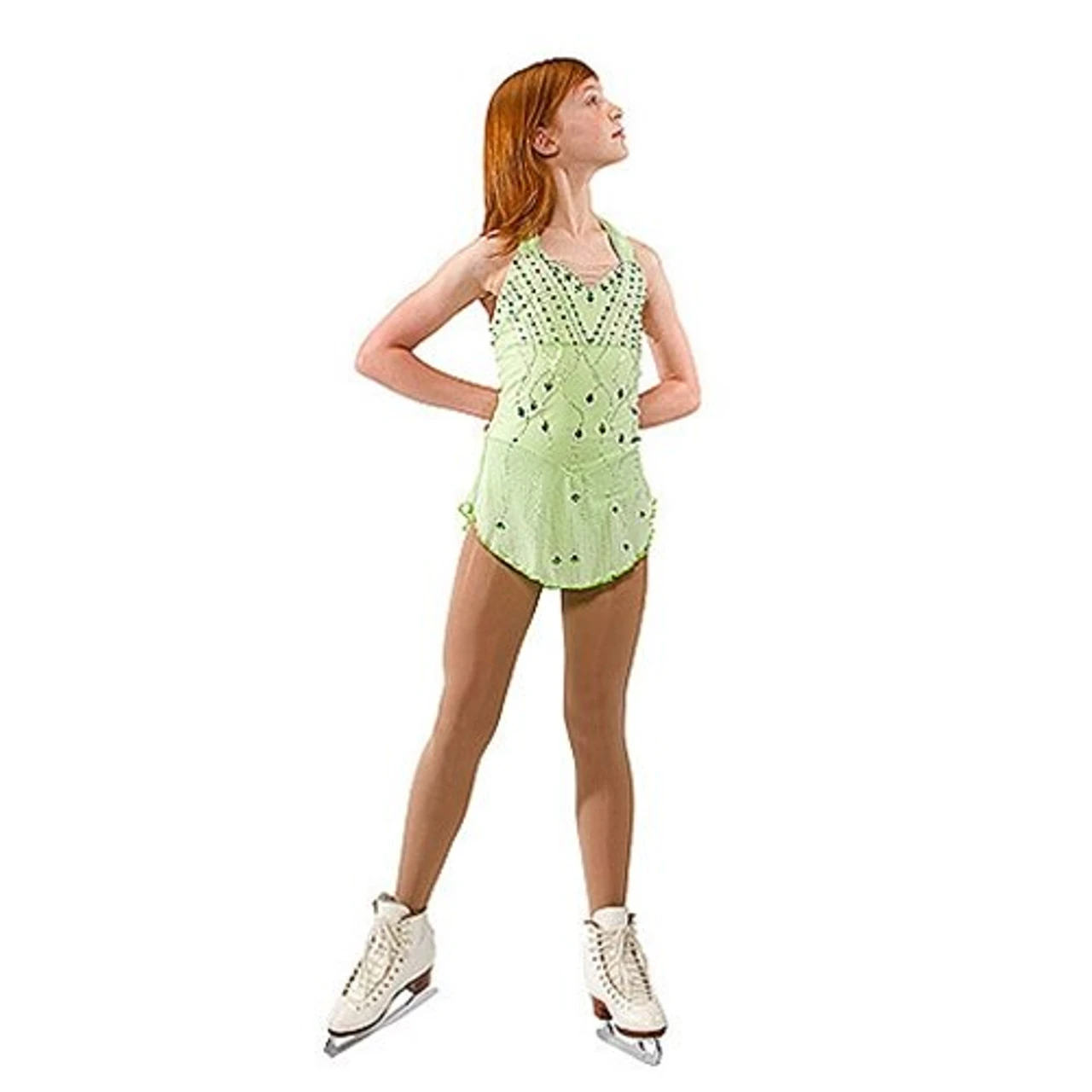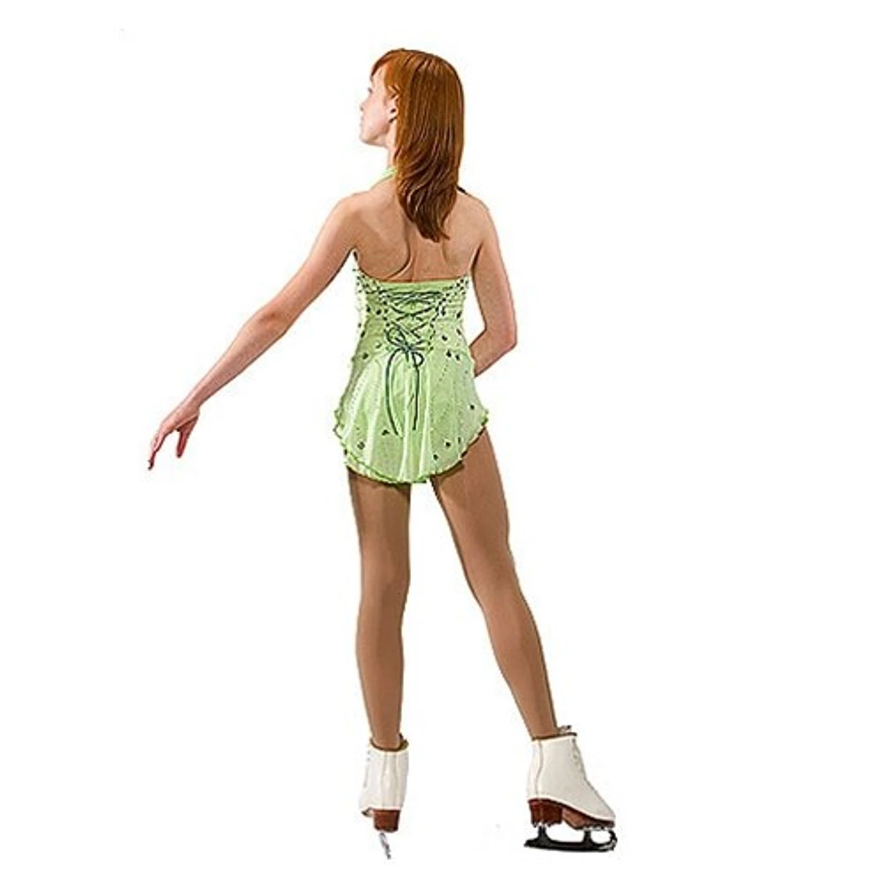 You’ll have a lucky leprechaun sitting on your shoulder when you skate in this lyrical dress. Empire bustline with sweetheart neck (nude mesh insert for support); hooks at back of neck. Feminine corset back holds satin rattail cording. Soft double-layer stretch illusion flat skirt. What makes this dress truly special is the incredible crystal pattern!! This dress is equally beauitful in other color combinations–the “trailing shamrocks” look like garden blossoms. Truly stunning!