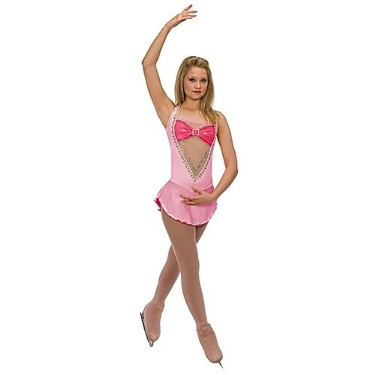 Cutting edge design in a sophisticated competition dress. Plunging neckline with contrast stretch illusion mesh “bra”–accented with crystal buckle. Halter neck dance dress secures with a hook at back of neck, and bra hooks at back also. Soft drapes down the back. Pink dance dress has flat front skirt with contrast underskirt. Mesh insert has optional nude lining for younger skaters.