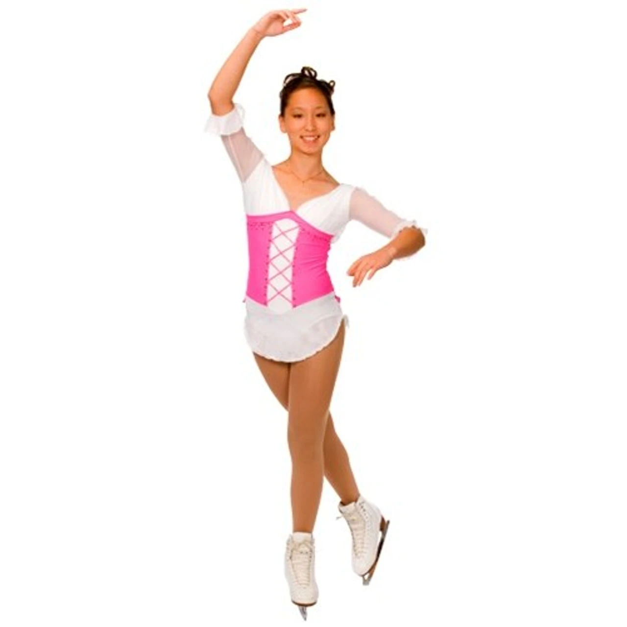 Our newest “Can-Can” or Spanish dress!! Bright and light in Italian matte tricot or traditional in stretch velvet. Softly gathered bustline of stretch illusion mesh ends with 3/4 ruffled “peek-a-boo” sleeves. Corset bodice with spaghetti-tie accent in center front and back peplum. Flat front skirt with closed sides and lettuce-edge.