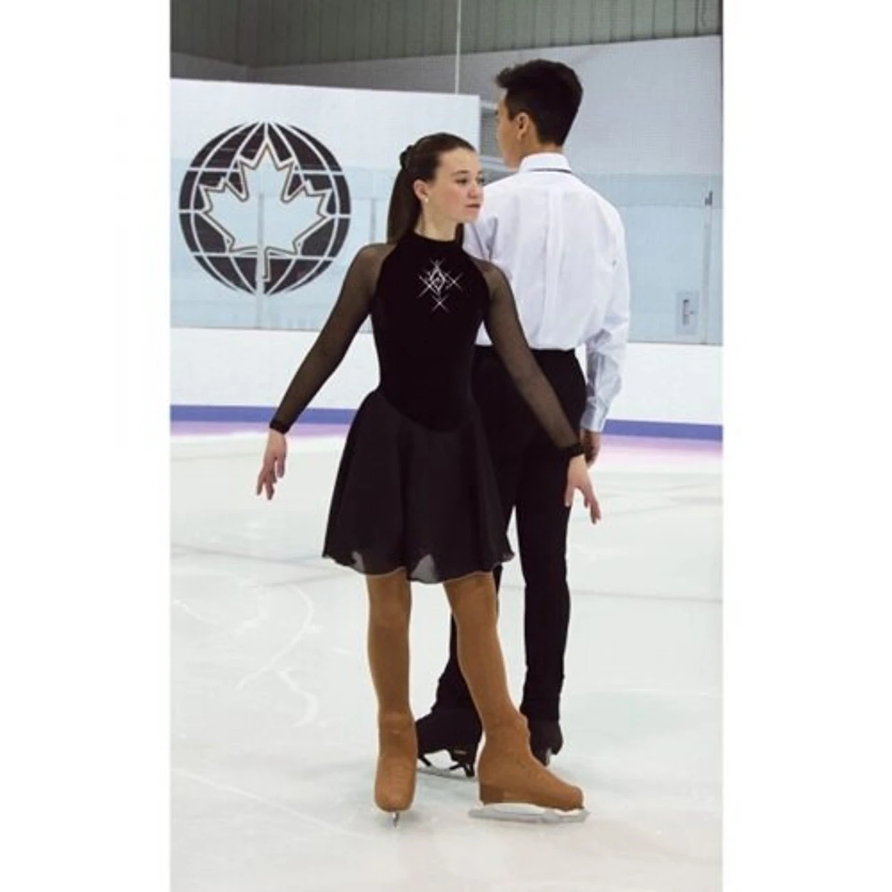 This is the essential black dance dress. It exudes timeless elegance with long mesh sleeves, a high neck with a diamond burst crystal accent and a traditional back keyhole.