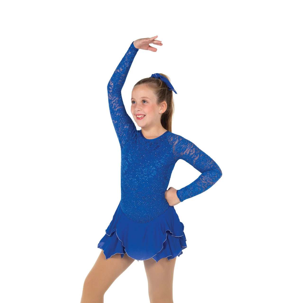 Pretty glitter lace dresses with dropped keyhole backs accented by a cluster of crystals, and lovely tulip hem skirts edged in silver. Lined in lycra.
