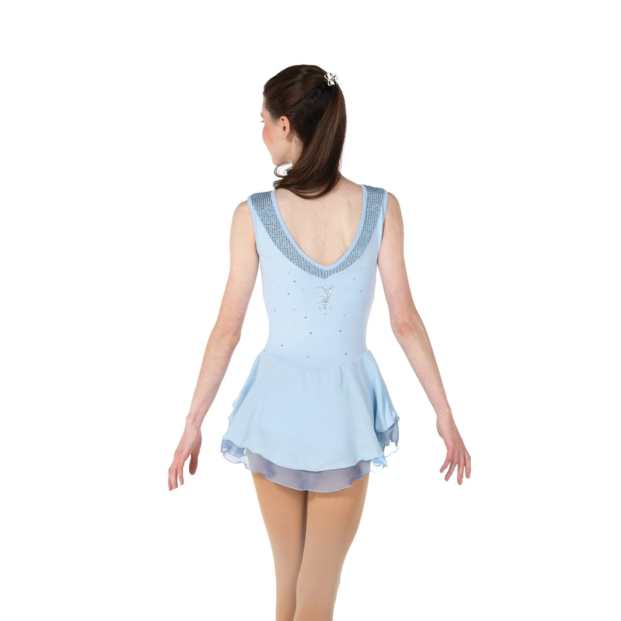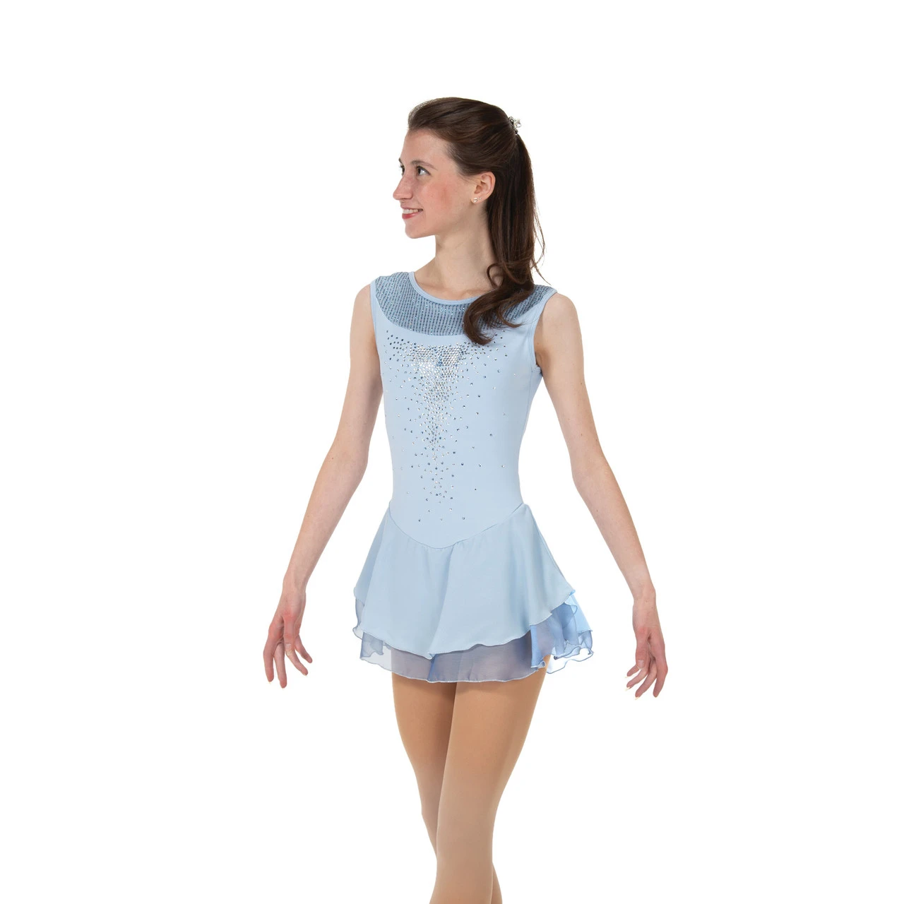 Soft powder blue lycra dress with a sweep of glitter around the neckline and a glistening bouquet of ice blue and clear crystals. Double skirt of lycra over chiffon; lined.