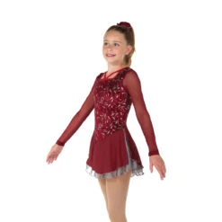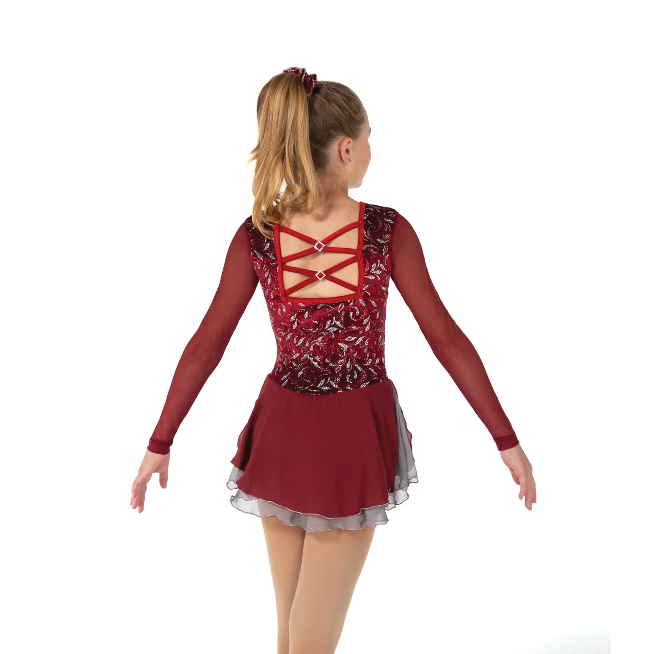 Wine glitter velvet dress with long mesh sleeves, front strap detailing, crystal accents at the back and a double layer skirt.