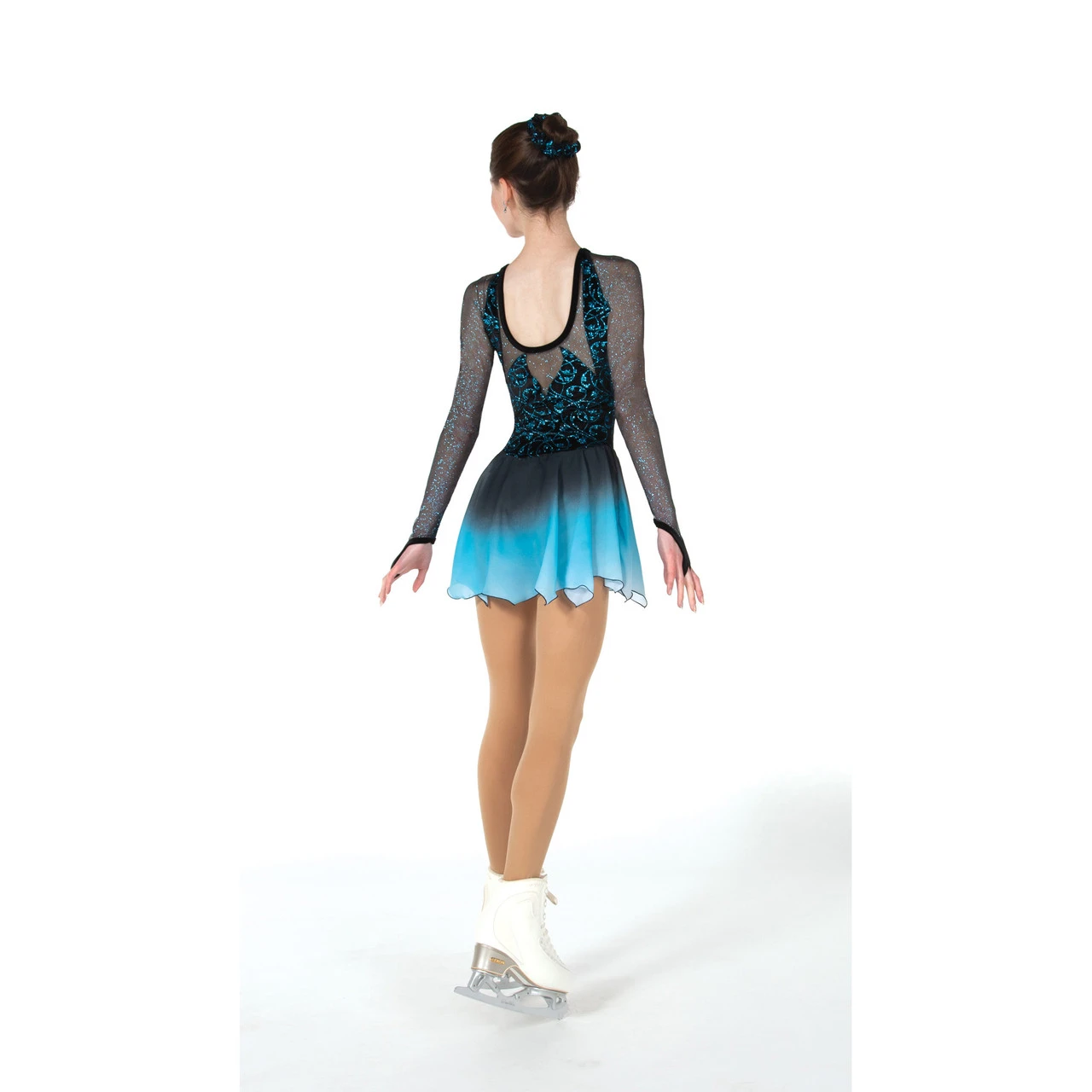 The tulip hem georgette skirt that shades from black at the waist to turquoise at the hem plays up the blue over black glitter of the velvet bodice and shimmer mesh sleeves. Cut-out shaping at the front and back and finger points on the sleeves add extra finesse.