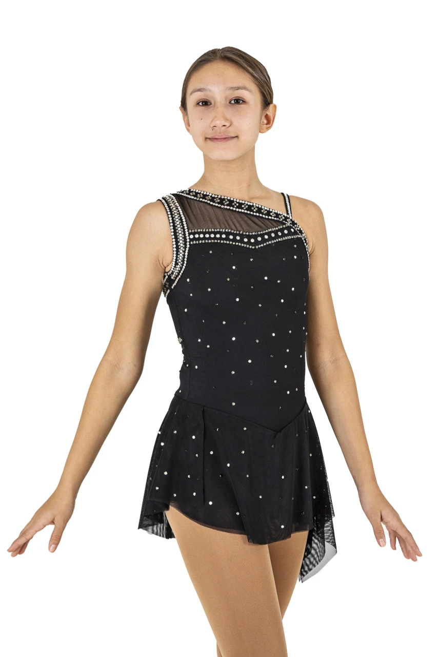 New for 2020 Posh Icewear presents this edgy asymetrical sleeveless dress. This dress is made of 4 way stretch microfiber with power mesh over top. Dress 2004 boasts an asymmetrical double mesh skirt leaving a raw finished edge for ultimate flow and motion. Posh’s 2020 line is MADE TO ORDER. Please allow 2-3 weeks for dress to be made.Â