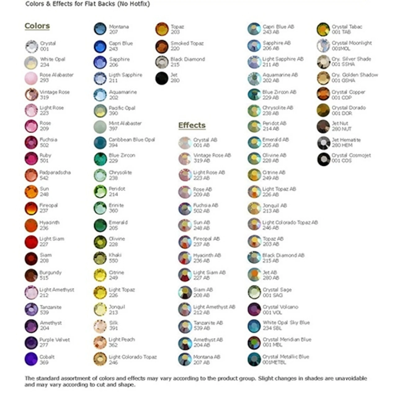| Color | Clear, Clear AB, Padpaadscha, Sun, Citrine, Topaz, Dorado, Volcano, Lt. Rose, Rose, Fuschia AB, Fuschia, Black Diamond, Hematite, Jet, Tobac, Siam, Lt. Siam, Peridot, Emerald, Sapphire, Lt. Sapphire, Meridian Blue, Montana Blue, Metallic Blue, Capri Blue, Aqua, Tanzanite, Amethyst |